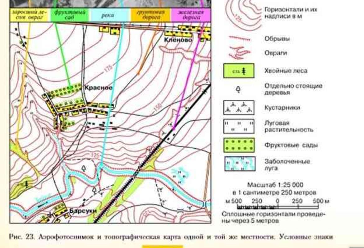3) на правом берегу кварталы посёлка, полевая дорога, отдельно стоящие деревья, кустарники; на левом берегу линии связи, обрывы, овраги, отдельно стоящие деревья