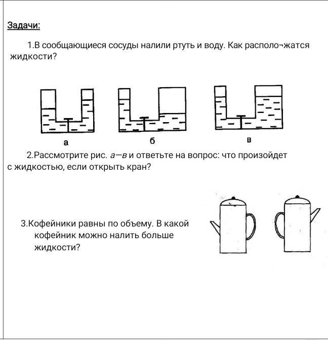 1.В сообщающиеся сосуды налили ртуть и воду. Как расположатся жидкости?