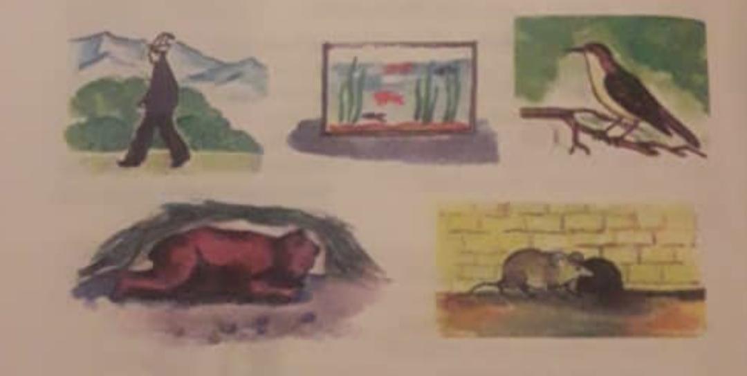 1)Сергей идёт в аул 2) В аквариуме есть много рыб. 3) ......4)не видно. 5) у мышки есть свой домик