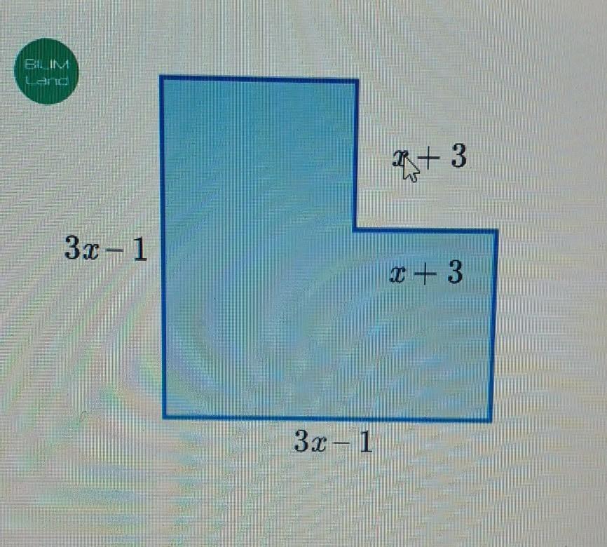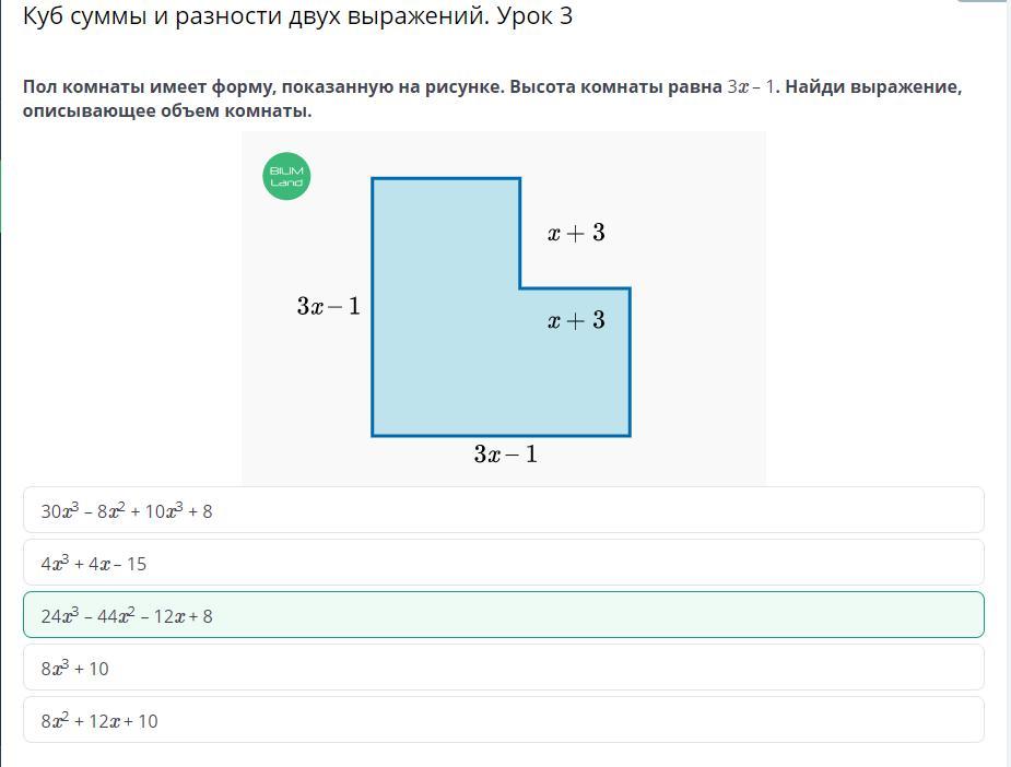Пол комнаты имеет форму, показанную на рисунке. Высота комнаты равна 3x– 1. Найди выражение,