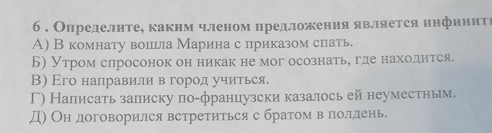 1)спать-опр. 2) осознать-сказ. 3) стричь - обст. 4) Написать - подл. 5) встретиться-доп.