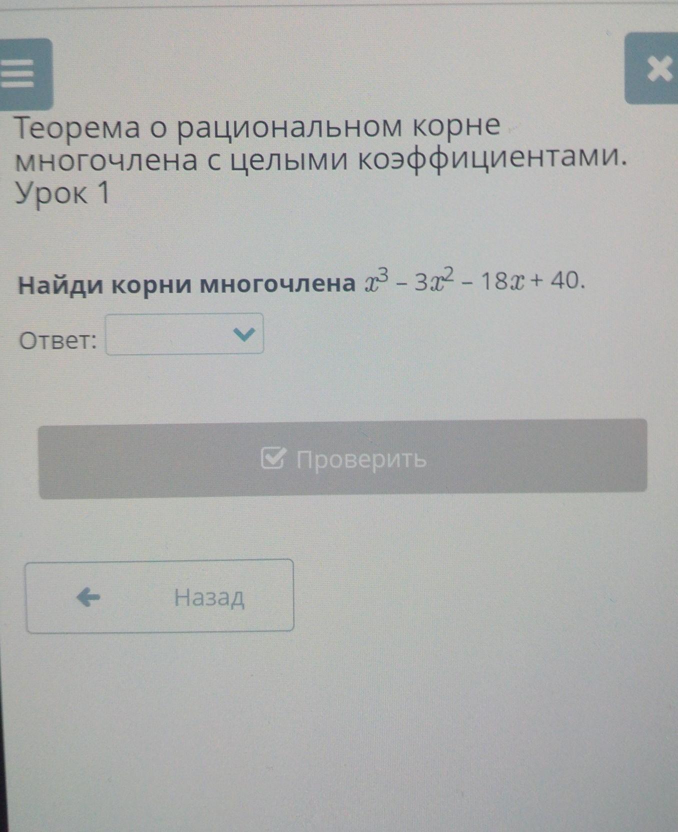 1. Выбираем один из корней многочлена, как один из целых множителей свободного члена. Вобщем, множителей у числа 40 много, но подстановкой определяем, что подходит число 2: