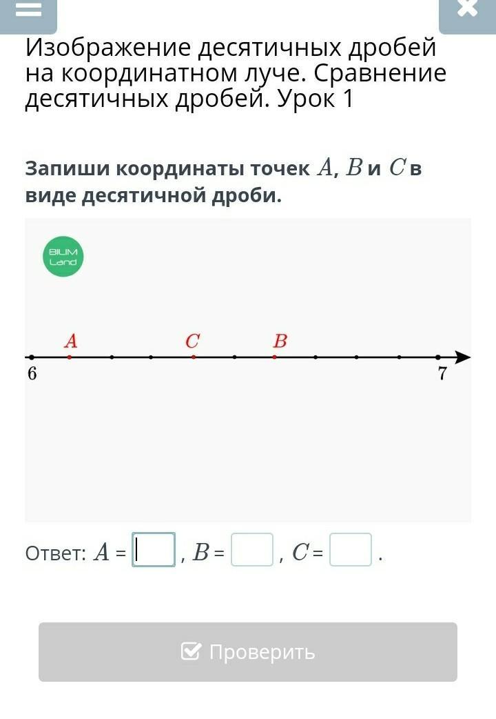 Запиши координаты точек A, B и C в виде десятичной дроби.