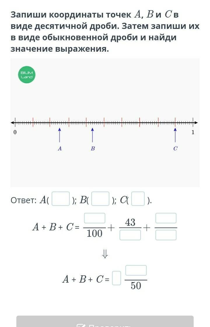 Запиши координаты точек A, B и C в виде десятичной дроби. Затем запиши их в виде обыкновенной дроби и найди значение выражения.