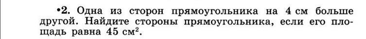 х - одна сторона; х+4 - вторая сторона.площать 45 см(квадратных). составляем уравнение: x(4+x)-45 x(в квадрате)+4x-45 x(в квадрате)+4x-45-0 D-16+180-196 корень квадратный с D-14 X2-5. так как в прямоугольнике одна из сторон может быть -9 мы берем лишь значение 5. тогда одна сторона, х%35,а вторая 5+4,тоесть 9. Ответ: одна сторона 5,