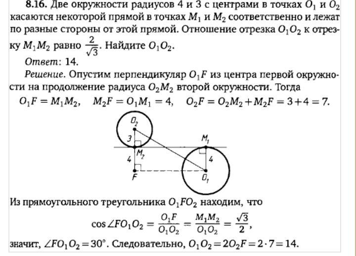 Две окружности радиусов 4 и 3 с центрами в точках О1 и О2 касаются некоторой прямой в точках М1 и М2 соответственно и лежат по разные стороны от этой прямой. Отношение отрезка О1 О2 к отрезку М1 М2 равно 2/√3. Найдите О1 О2