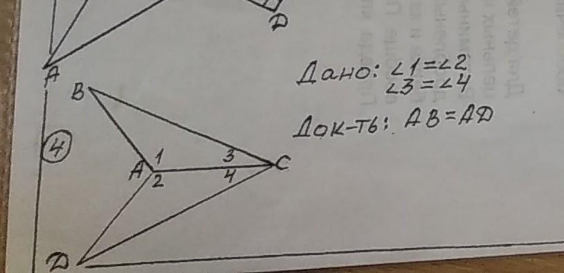 Треугольники АСД и АСВ равны по двум углам и стороне между ними( угол 1 равен углу 2, угол 3 равен углу 4, сторона АС, которая между ними, общая), значит и соответствующие стороны равны => АВ= АД