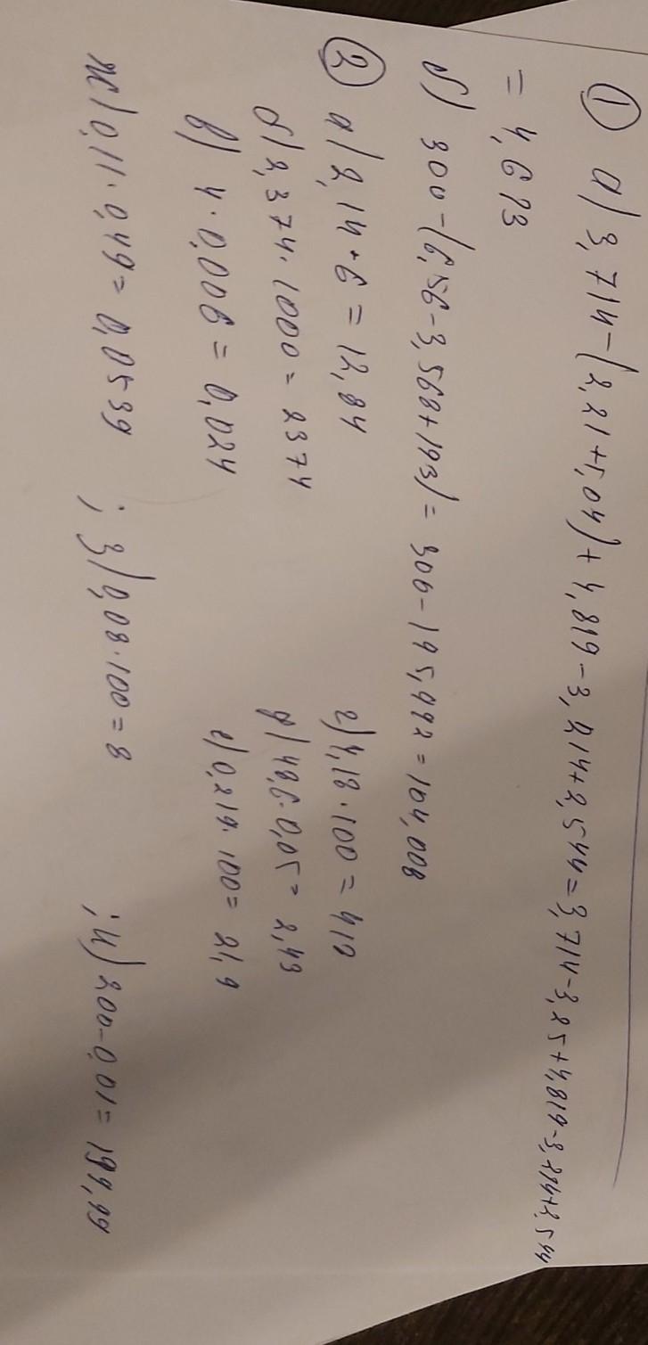 1. Найдите значение выражения:3,714 - (2,21 + 1,04) + 4,819 - 3,214 +2,544; 300 - (6,56 - 3,568 + 193).2. Выполните умножение:2,14 * 6; б) 2,374 * 1000; в) 4 * 0,006;4,18 * 100; д) 48,6 * 0,05; е) 0,219 * 100;0,11 * 0,49; з) 0,08 * 100; и) 200 - 0,01.