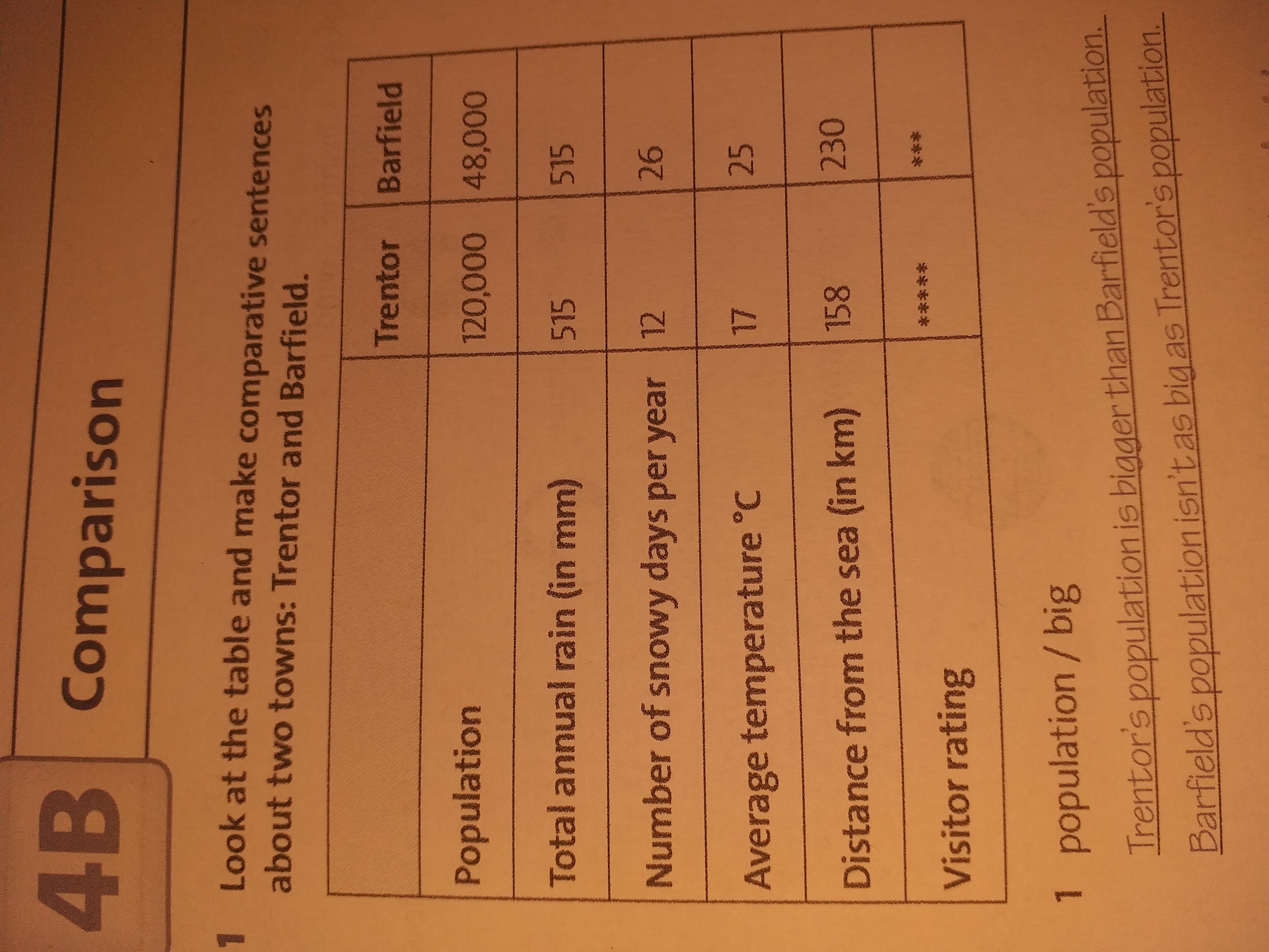 Look at the table and make comparative sentences about two towns : Trentor and Barfield