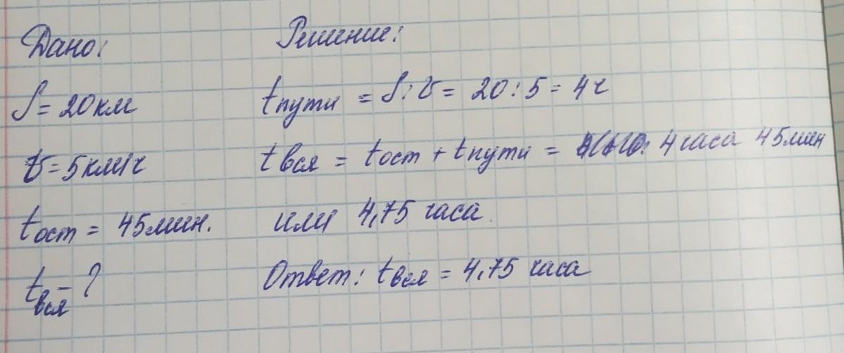 Турист прошёл 20 км, двигаясь со скоростью 5 км/ч. На остановки во время пути он затратил 45 мин. Сколько времени занял весь путь?