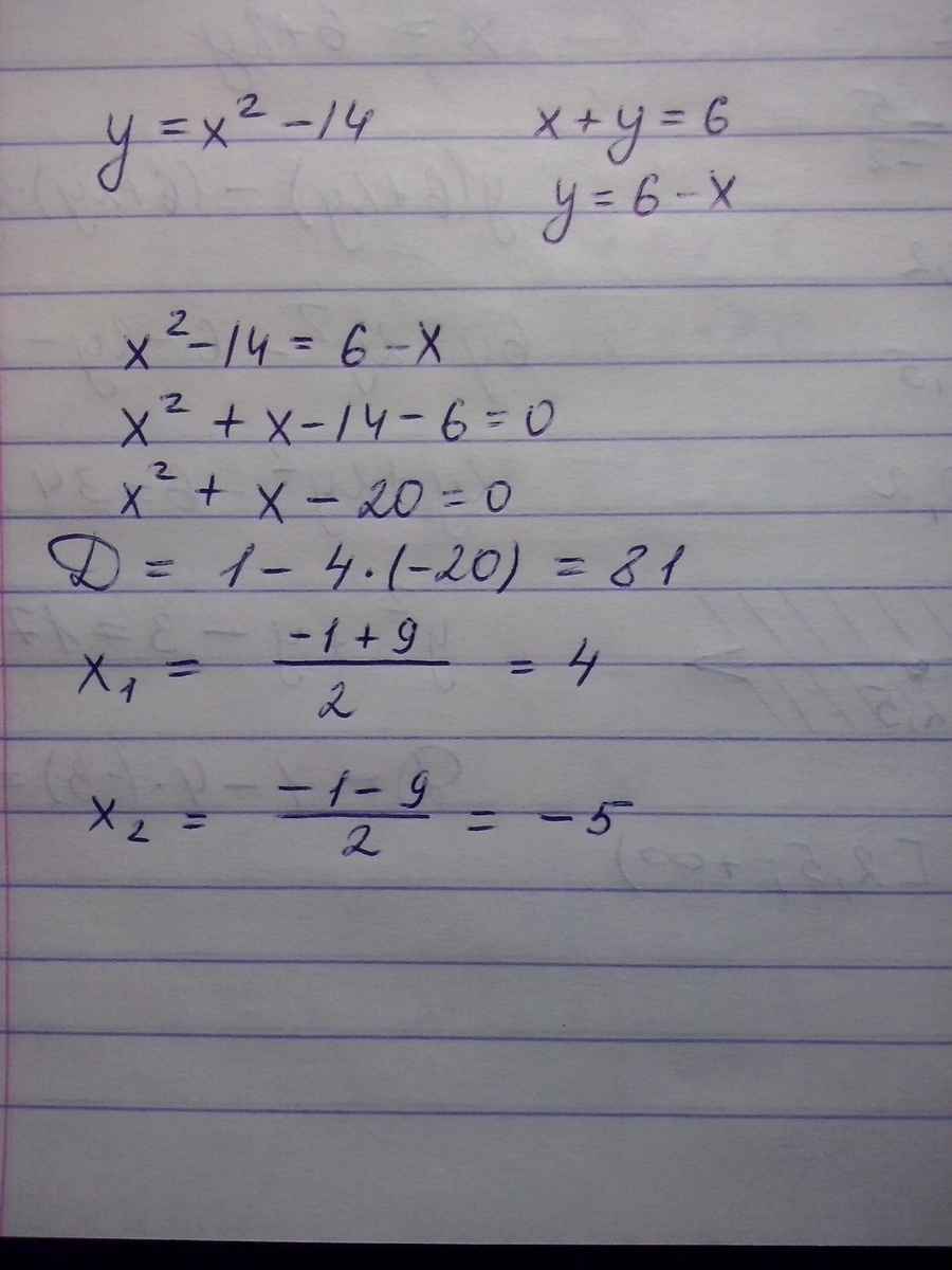 не выполняя построения,найдите координаты точек пересечения параболы y=x(в квадрате) - 14 и прямой x+y=6