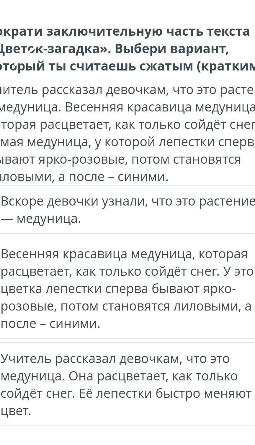 Третий вариант: Учитель рассказал девочки, что это медуница. Она расцветает, как только сойдёт снег. Ее лепестки быстро меняют цвет.
