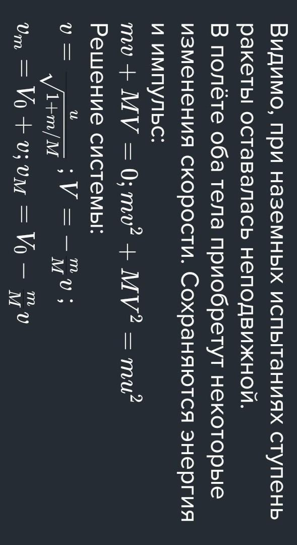 Третья ступень ракеты состоит из ракеты-носителя массой 500кг и головного конуса массой 10 кг. Между ними помещена сжатая пружина. При испытаниях на Земле пружина сообщила конусу скорость 5,1 м/с по отношению к ракете-носителю. Определить скорости конуса и ракеты, если их отделение произойдет на орбите при движении со скоростью 8,1 км/с относительно Земли.