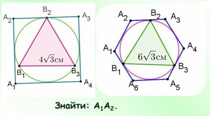 2. Сторона А(1)А(2) - это сторона правильного шестиугольника, описанного около окружности, в которую вписан правильный треугольник со стороной 6√3 см.