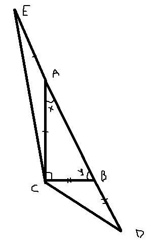 гіпотенузу AB прямокутного трикутника ABC продовжено в обидва боки так, що AE=AC, BD=BC. Точки D і E сполучені з вершиною C. Доведіть, що кут CED+ кут CDE=45