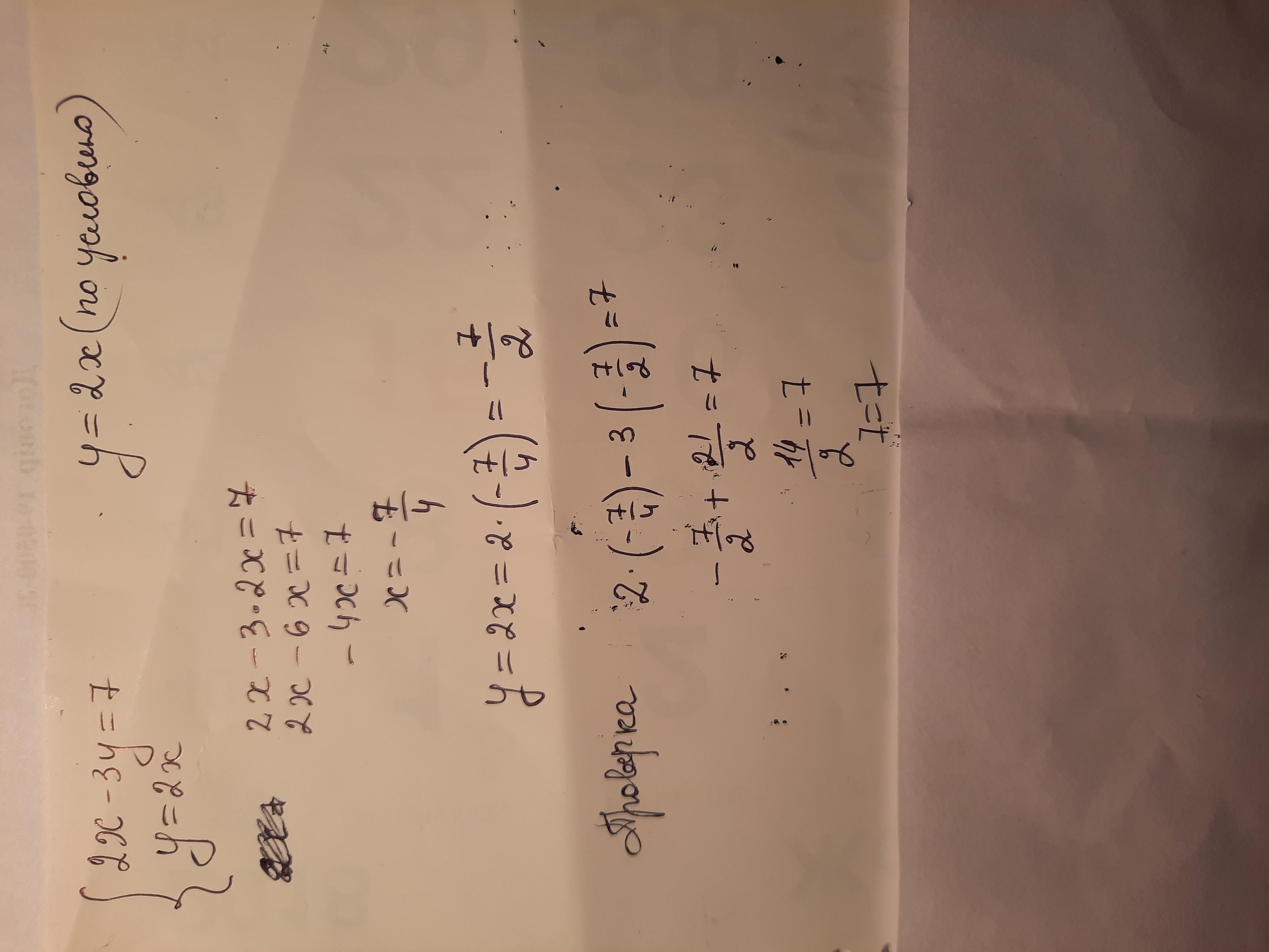На прямой 2x−3y=7 отмечена точка, абсцисса которой в 2 раза больше ординаты. Найдите ординату этой точки.