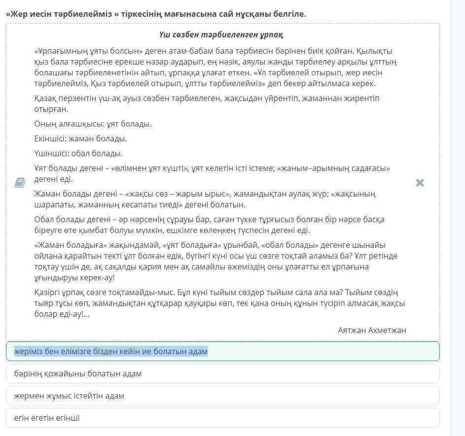 «Жер иесін тәрбиелейміз » тіркесінің мағынасына сай нұсқаны белгіле.