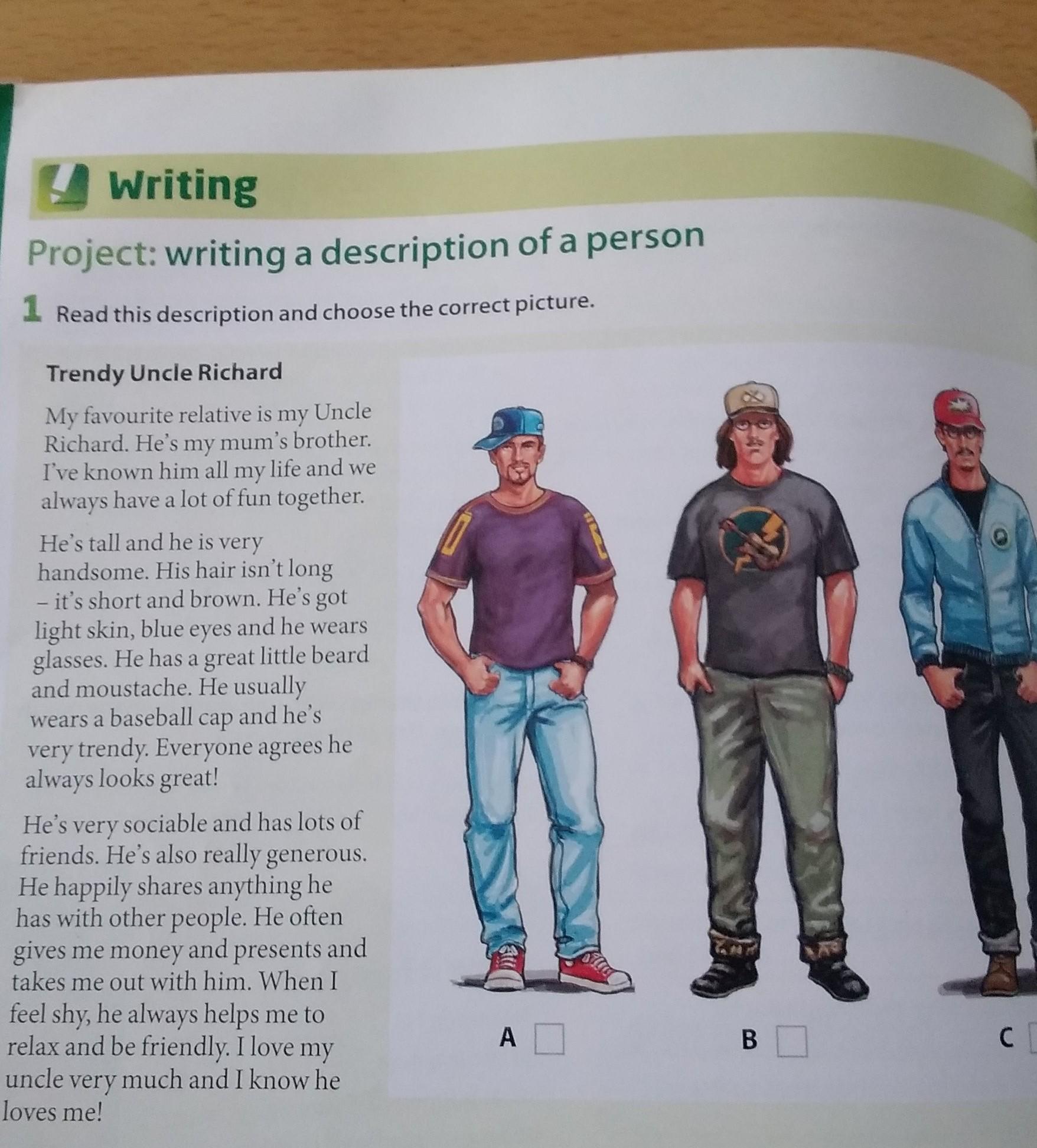 1 Прочтите это описание и выберите правильную картинку. Мой любимый родственник-дядя Ричард, Он мамин брат. Я знаю его всю жизнь, и нам всегда очень весело вместе, Он высокий и очень красивый, волосы у него не длинные - короткие и каштановые. У него светлая кожа, голубые глаза, и он носит очки. У него большая маленькая борода и усы. Он обычно носит бейсболку, и он очень модный, Все согласны, что он всегда выглядит великолепно! Он очень общительный, у него много друзей. А еще он очень щедрый. Он с радостью делится всем, что у него есть, с другими людьми. Он часто дает мне деньги и подарки и берет меня с собой. Когда я стесняюсь, он всегда помогает мне расслабиться и быть дружелюбным. я очень люблю своего дядю и знаю, что он любит меня! Это перевот задания