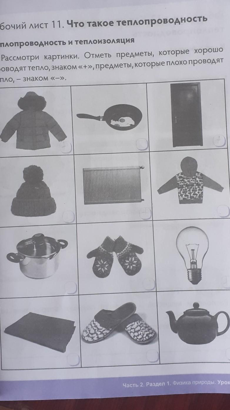 Рассмотри картинки Отметь предметы которые хорошо проводят знаком плюс предметы которые плохо проводит тепло знаком минус