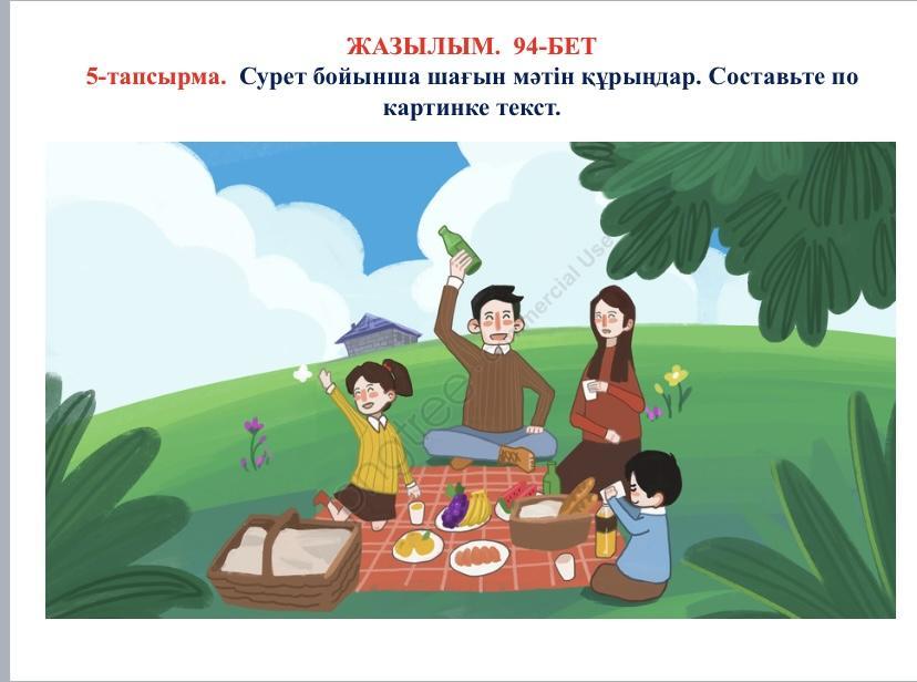 Күн ашық. Бүгін нығыз серуендейтін күн. Алина бауырымен анасымен әкесімен табиғат аясына демалуға баруды шешті. Ендігі олар өздеріне жайлы орынды таңдап жайғасты. Алина бауырымен біраз ойнады және анасы қойған жемістерді жеді. Сонымен қатар жаңа балалармен ойнап, маз мейрам болды. Барғы да көңілді күймен үйге қайтты. Бүгінгі күн ерекше әдеттегіден болды.