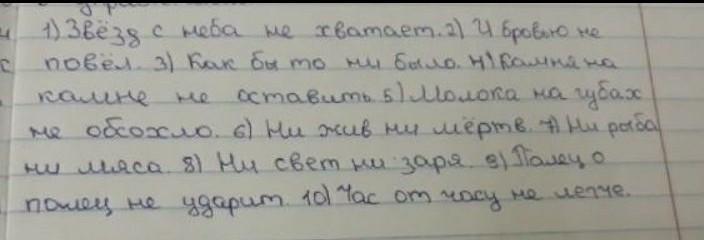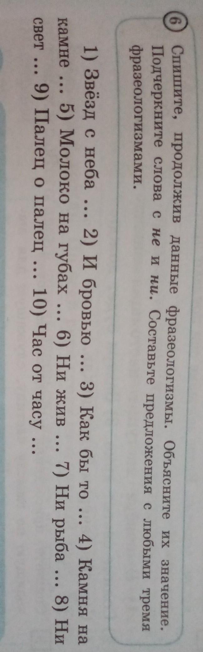 Упр 6 Спишите, продолжив данные фразеологизмы. Объясните их значение.Подчеркните слова с не и ни. Составьте предложения с любыми тремя фразеологизмами.