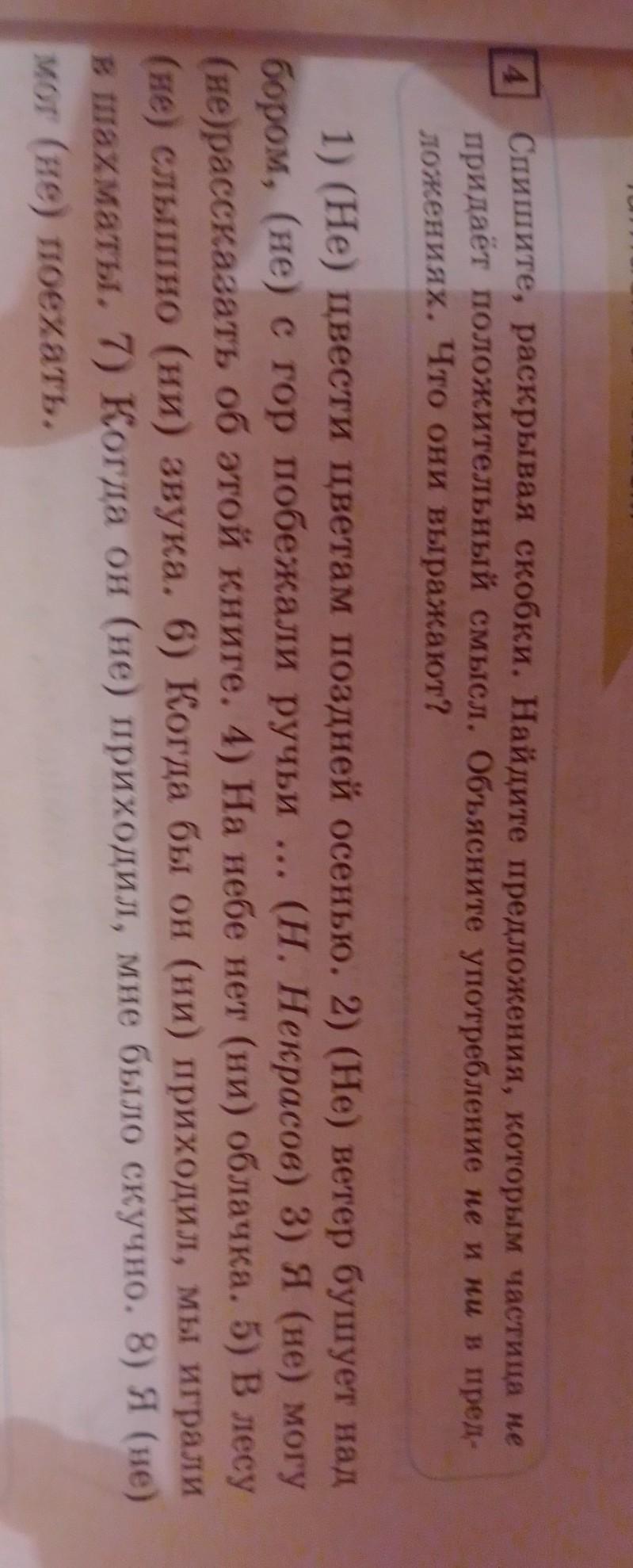 1. Не цвести цветам поздней осенью. 2. Не ветер бушует над бором, не с гор побежали ручьи... 3. Я не могу не рассказать об этой книге. 4. На небе нет ни облачка. 5. В лесу не слышно ни звука. 6. Когда бы он ни приходил, мы играли в шахматы. 7. Когда он не приходил, мне было скучно. 8. Я не мог не поехать.