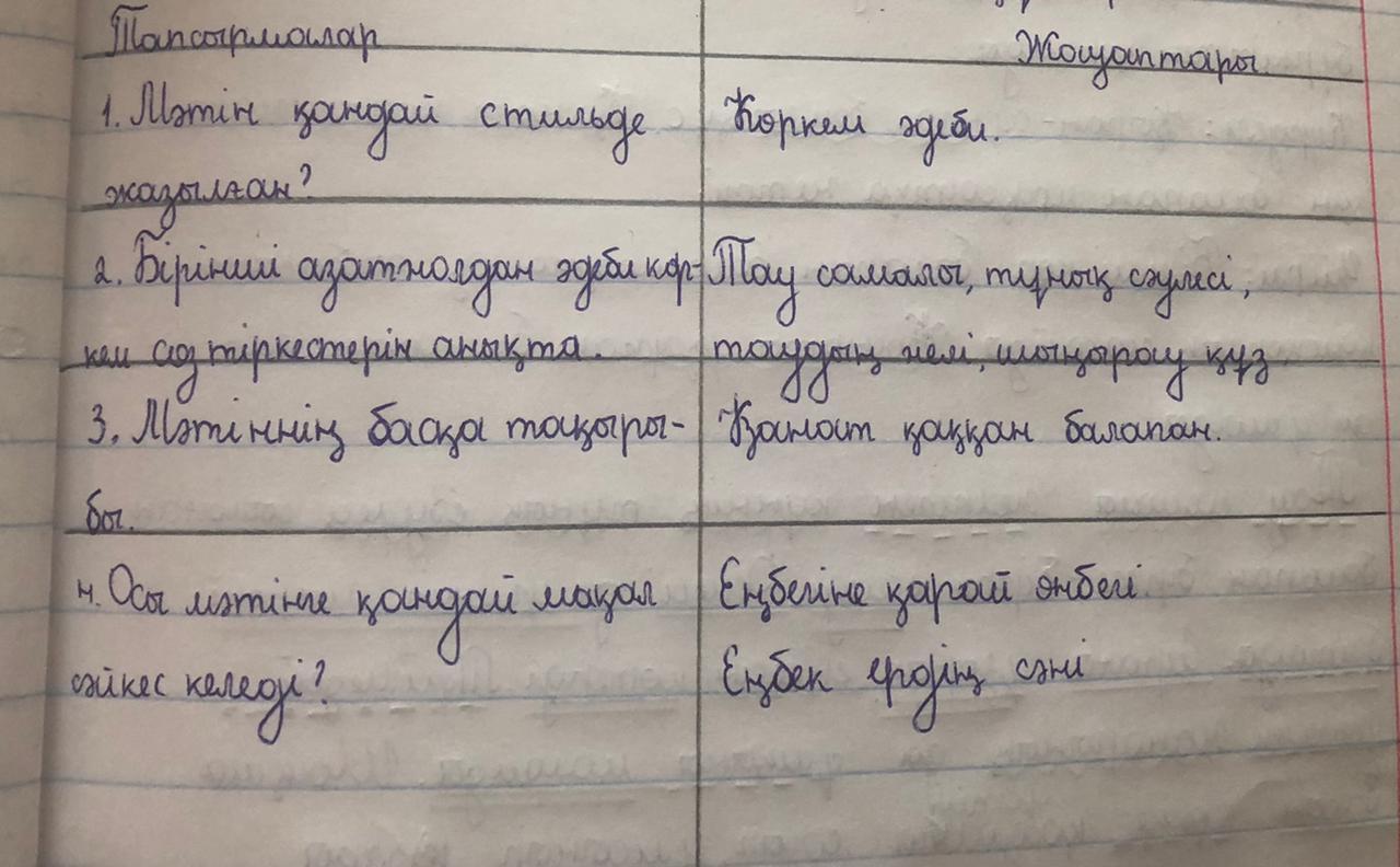 "Қыранның балапаны" атты мәтінге байлагысты сұрақтарға жауап беріңіз. 1. Мәтін қандай стильде жазылған? 2. Мәтінге басқа қандай тақырып таңдар едіңіз? 3. Осы мәтінге қандай мақал сәйкес келеді?