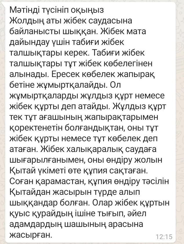 Мәтінде Жібек жолы қалай пайда болғанын баяндаған. Және Қытай жібек өндіру жолдарын құпия сақтаған екен.