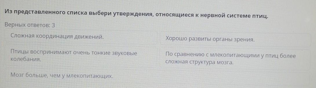 Из представленного списка выбери утверждения, относящиеся к нервной системе птиц.