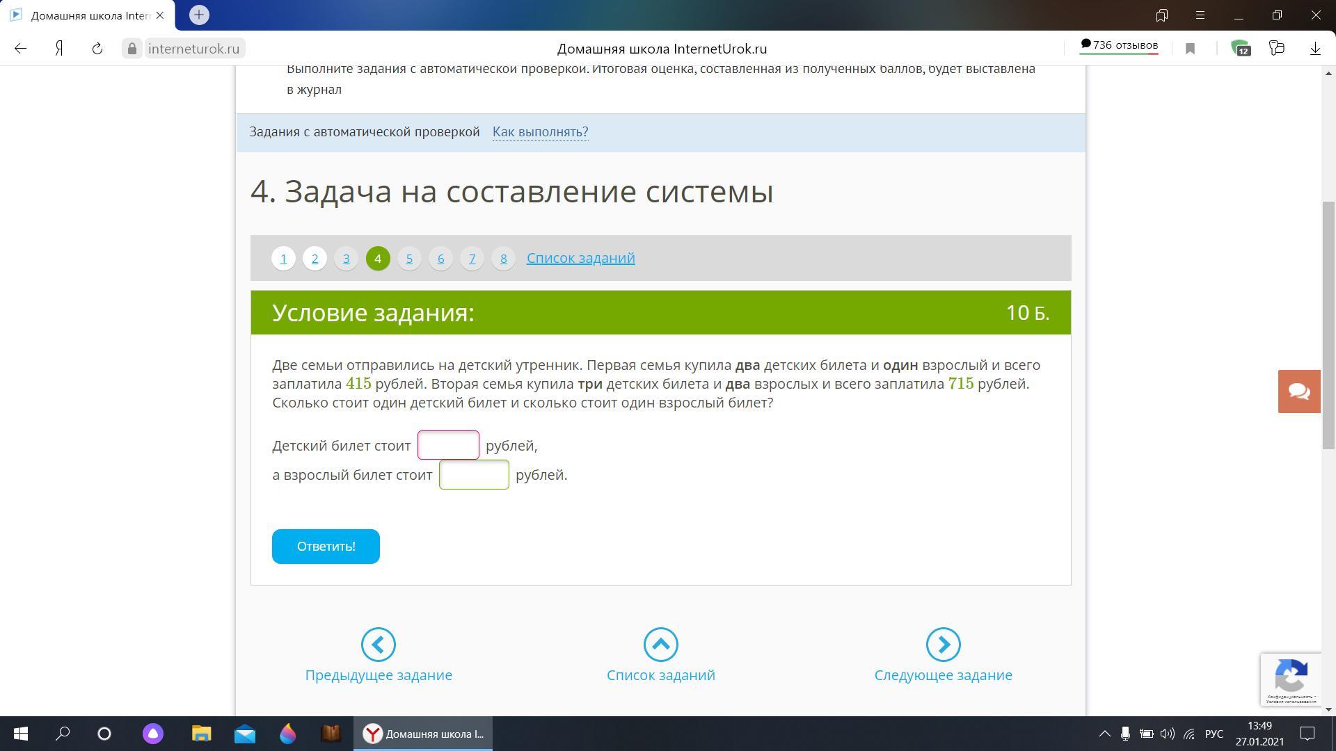 x - стоимость детского билета, рублей.