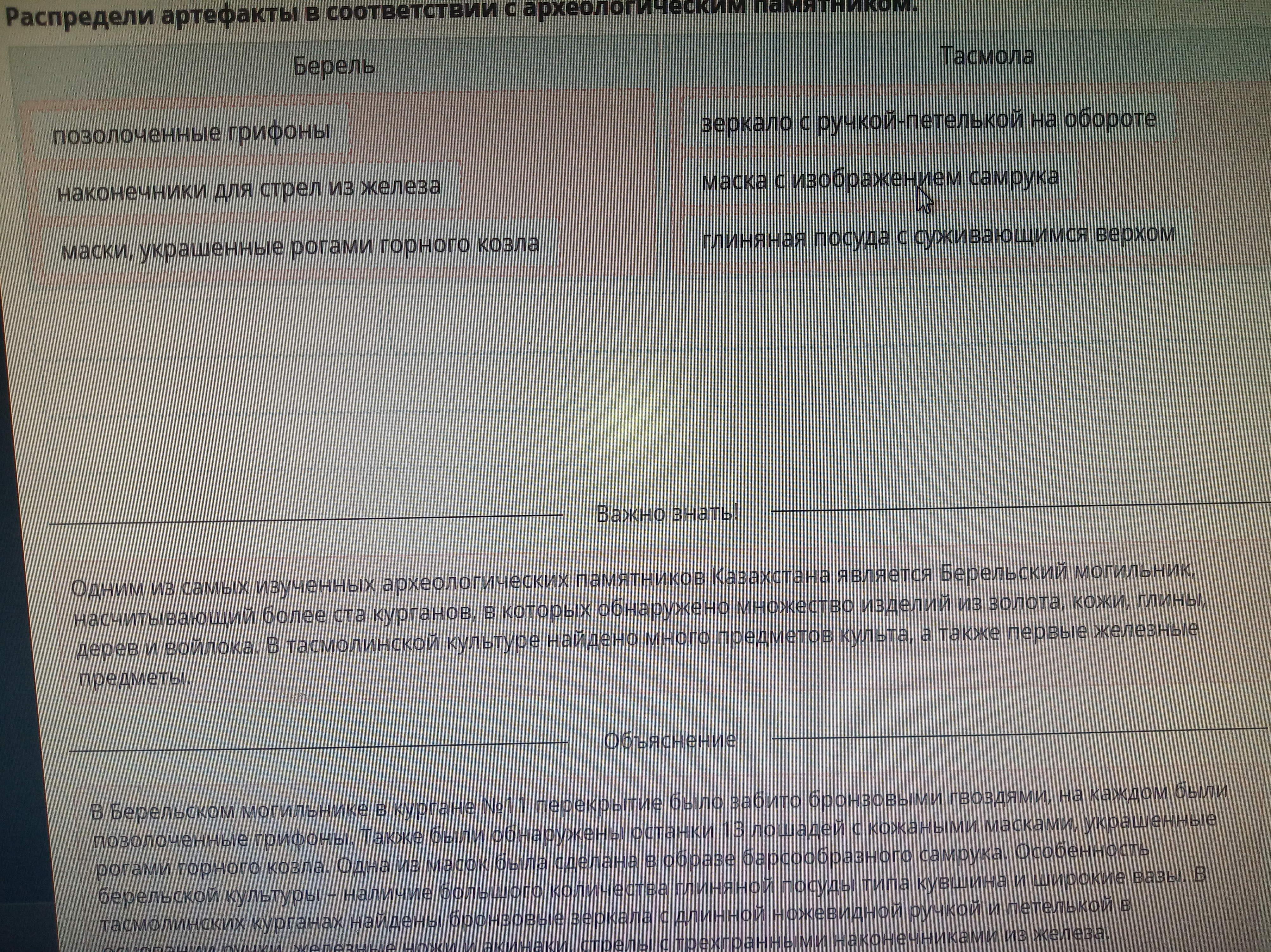 Распредели артефакты в соответствии с археологическим памятником.