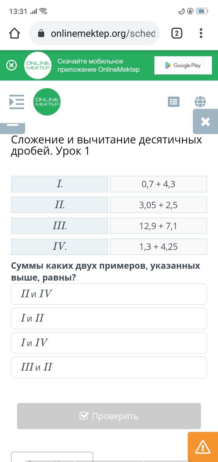 II и IV I и II I и IV III и II Сложение и вычитание десятичных дробей. Урок 1