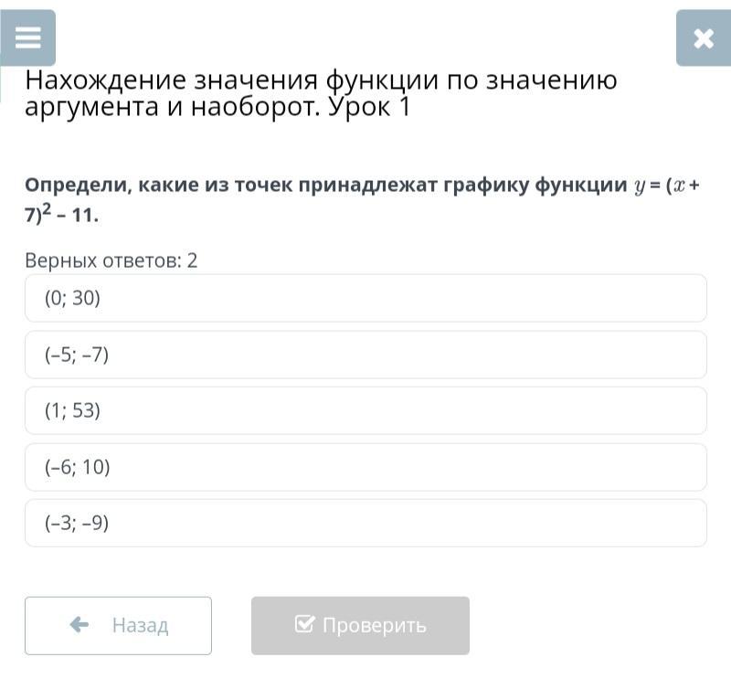 (0+7)² – 11 = 7² – 11 = 49 – 11 = 38 ≠ 30 - не принадлежит;