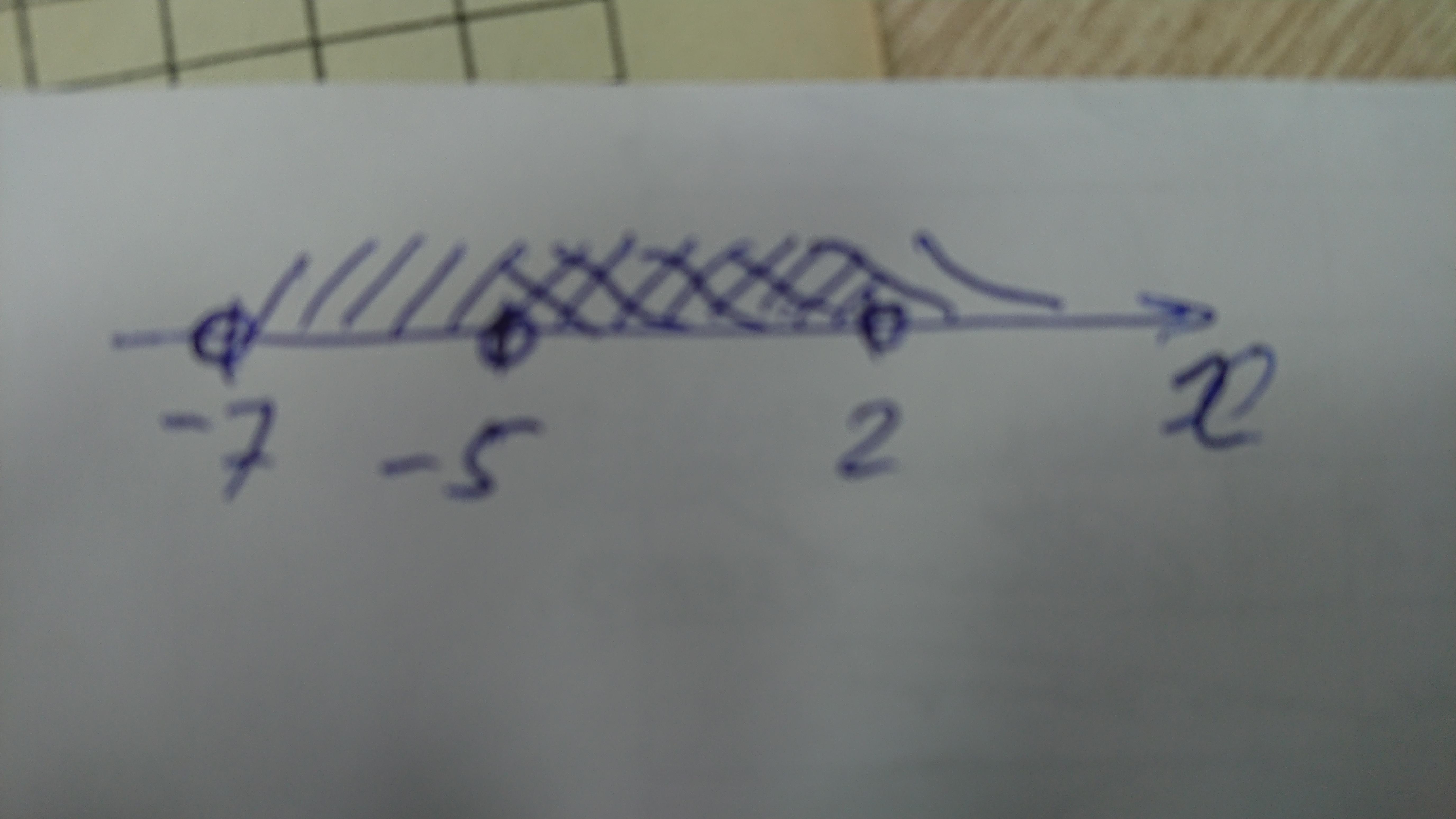 Ответ: х в диапазоне от минус 5 до 2, не включая концы интервала. См фото.