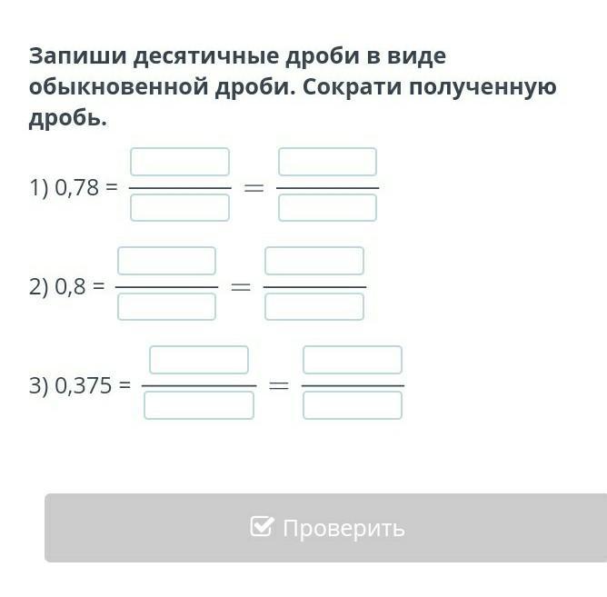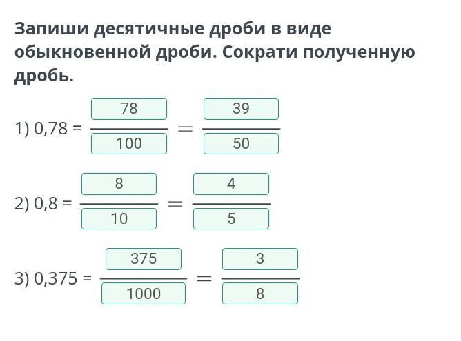 Запиши десятичные дроби в виде обыкновенной дроби. Сократи полученную дробь.