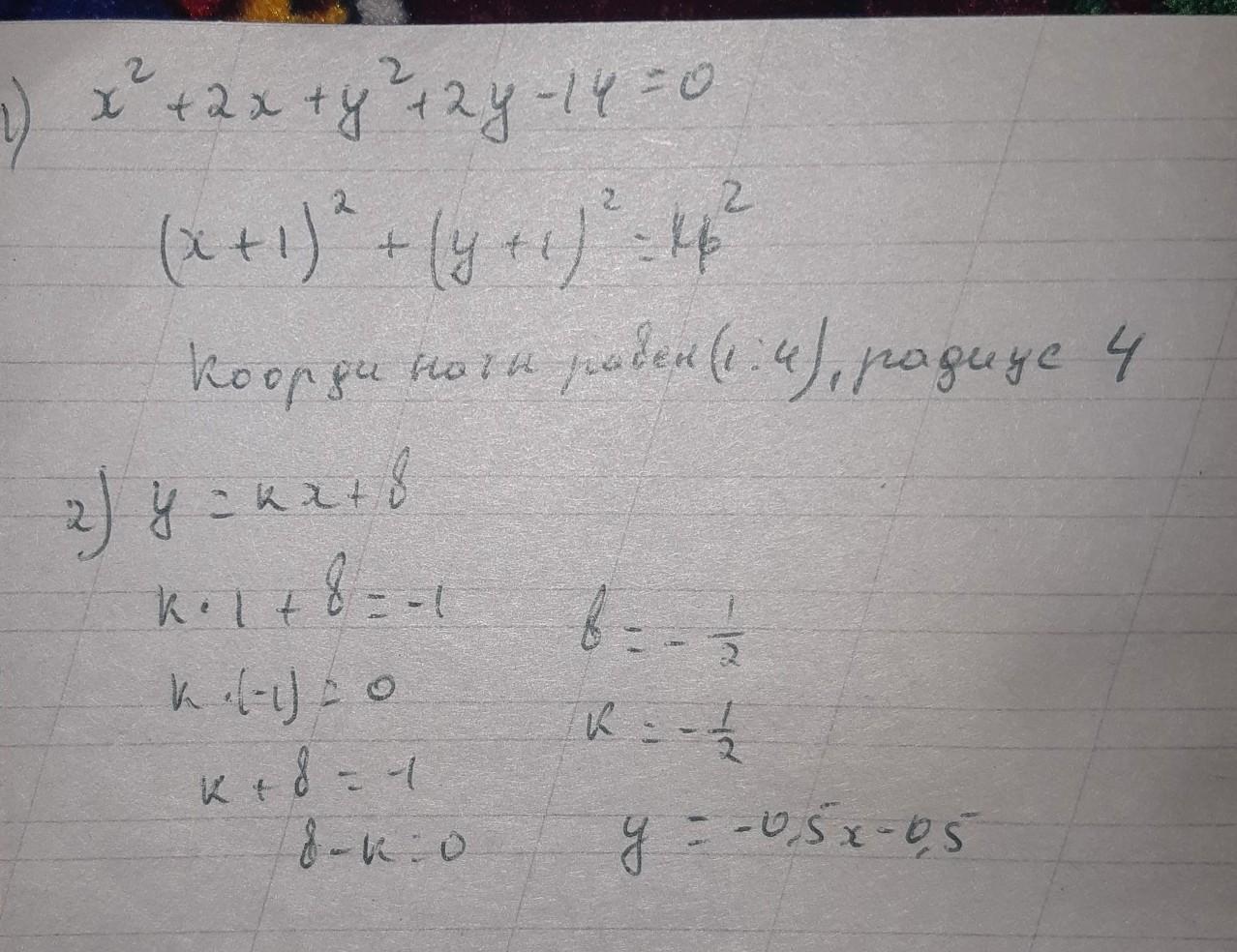 1.Определите центр и радиус окружности, заданной уравнением : x²+2x+y²+2y-14=0