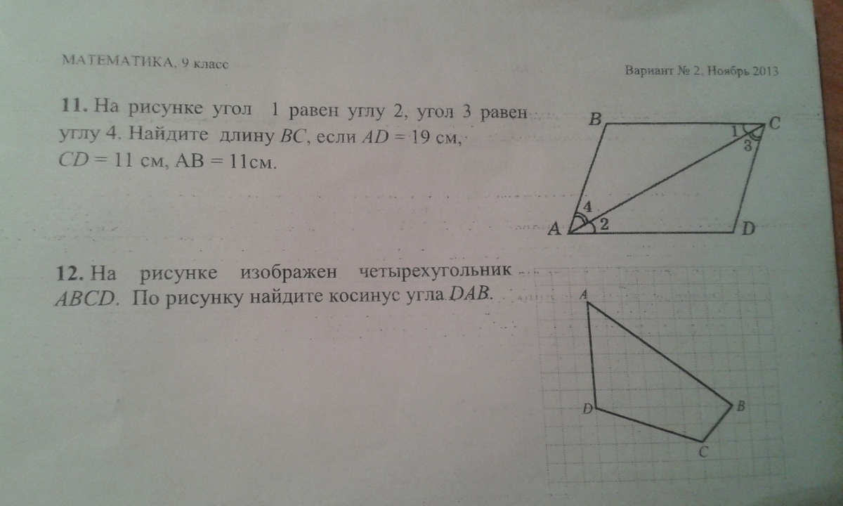 1 задача. Этот четырехугольник является параллелограммом, так как накрест лежащие углы 1 и 2, 3 и 4 равны, и противоположные стороны равны по 11. Значит AD=BC=17