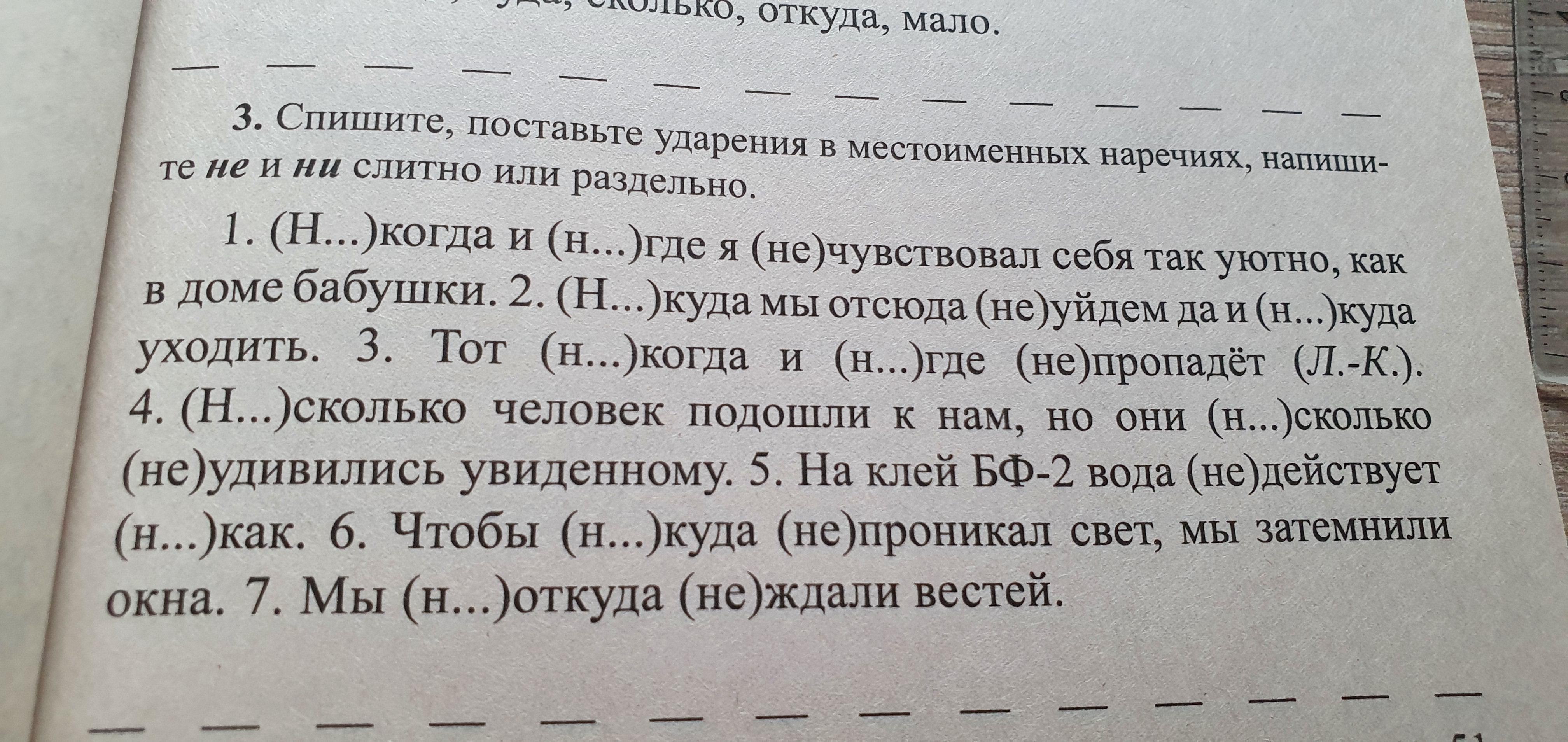 Никогда, нигде, не чувствовал, никуда, не уйдем, некуда, никогда, нигде, не пропадет, несколько, нисколько, не удивились, не действует, никак, никуда, не проникал, ниоткуда, не ждали.