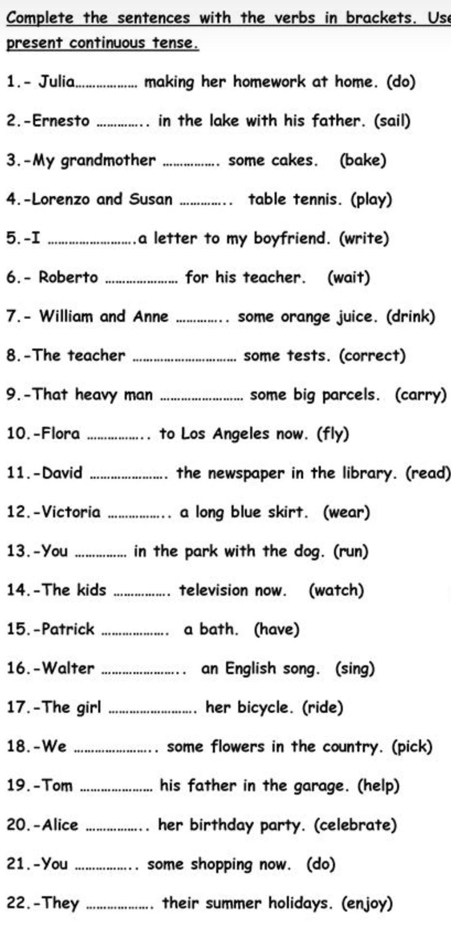 Complete the sentences with the verbs in brackets. Use present continuous tense. 1.- Julia... making her homework at home. (do) 2.-Ernesto in the lake with his father. (sail) 3.-Мy grandmother some cakes. (bake) 4.-Lorenzoо and Susan. table tennis. (play) 5.-I .a letter to my boyfriend. (write) 6.- Roberto for his teacher. (wait) 7.- William and Anne some orange juice. (drink) 8.-The teacher some tests. (correct) 9.-That heavy man some big parcels. (carry) 10.-Flora ..... to Los Angeles пow. (fly) 11.-David the newspaper in the library. (read) 12.-Victoria a long blue skirt. (wear) 13.-Уou ...... in the park with the dog. (run) 14.-The kids ...... television now. (watch) 15.-Patrick a bath. (have) 16.-Walter an English song. (sing) 17.-The girl her bicycle. (ride) 18.-We some flowers in the country. (pick) 19.-Tom his father in the garage. (help) 20.-Alice her birthday party. (celebrate) 21.-Уou ......some shopping now. (do) 22.-They their summer holidays. (enjoy)