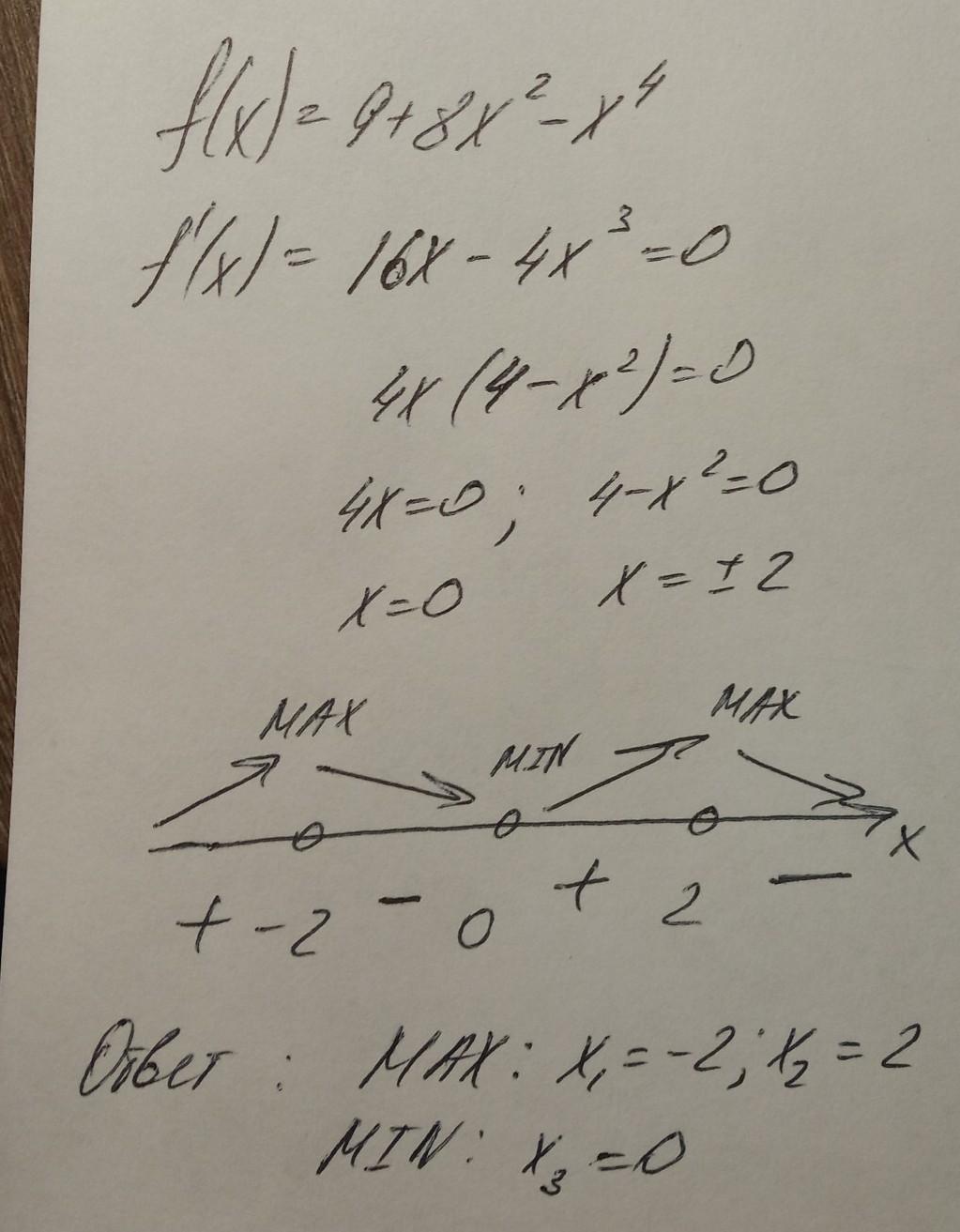 4х(4-х²)=0 x₁ = 0 ; х₂ = 2; х₃ = -2 это критические точки, но пока не понятно, какая есть минимум, а какая максимум