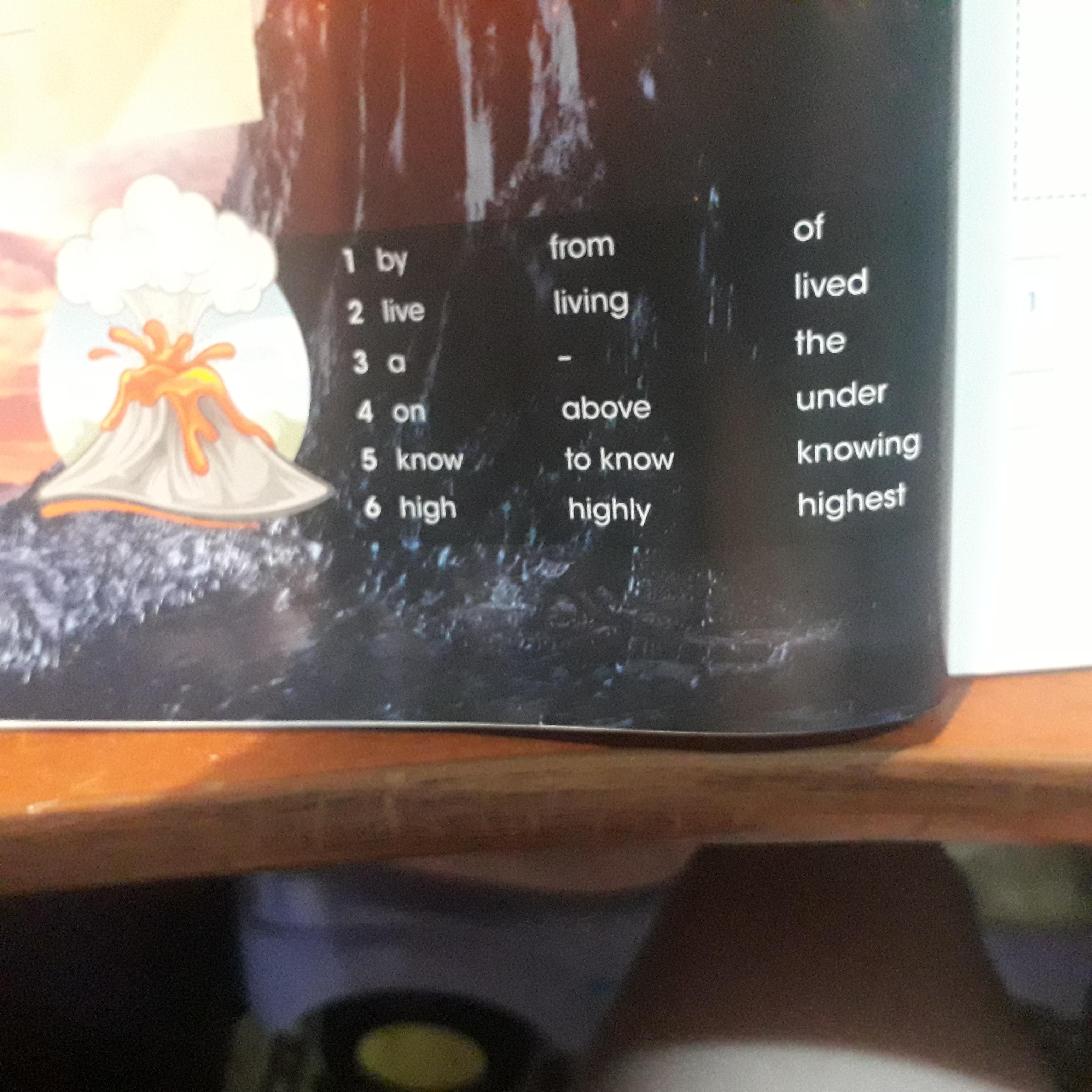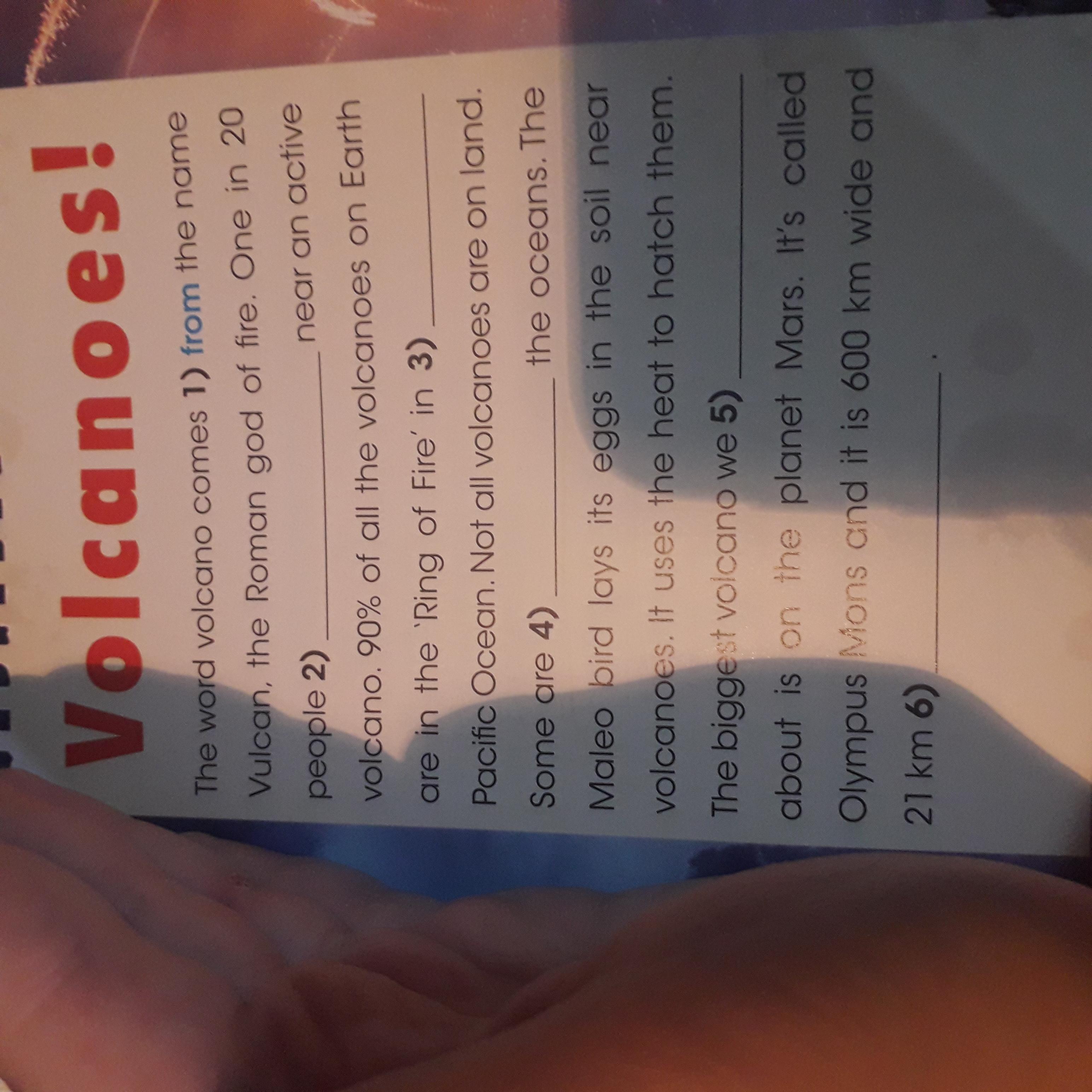 The word volcano comes 1) from the name Vulcan, the Roman god of fire. One in 20 people 2) live near an active volcano, 90% of all the volcanoes on Earth are in the 'Ring of Fire in 3) the Pacific Ocean. Not all volcanoes are on land. Some are 4) under the oceans. The Maleo bird lays its eggs in the soil near volcanoes. It uses the heat to hatch them. The biggest volcano we 5) know about is on the planet Mars. It's called Olympus Mons and it is 600 km wide and 21 km 6) high.
