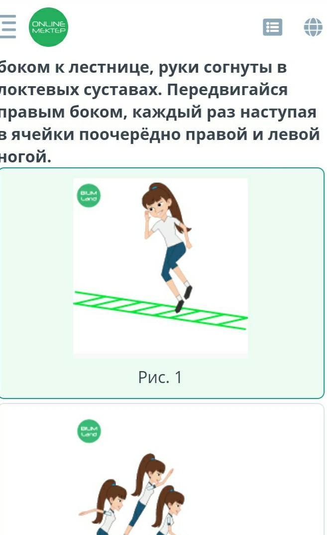 Прими исходное положение правым боком к лестнице, руки согнуты в локтевых суставах. Передвигайся правым боком, каждый раз наступая в ячейки поочерёдно правой и левой ногой.