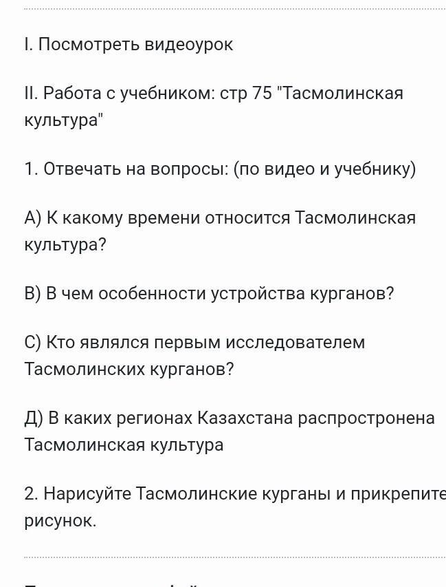 А) В хронологическом отношении памятники тасмолинской культуры делятся на два этапа: VII—VI вв. и V—III вв. до н. э.