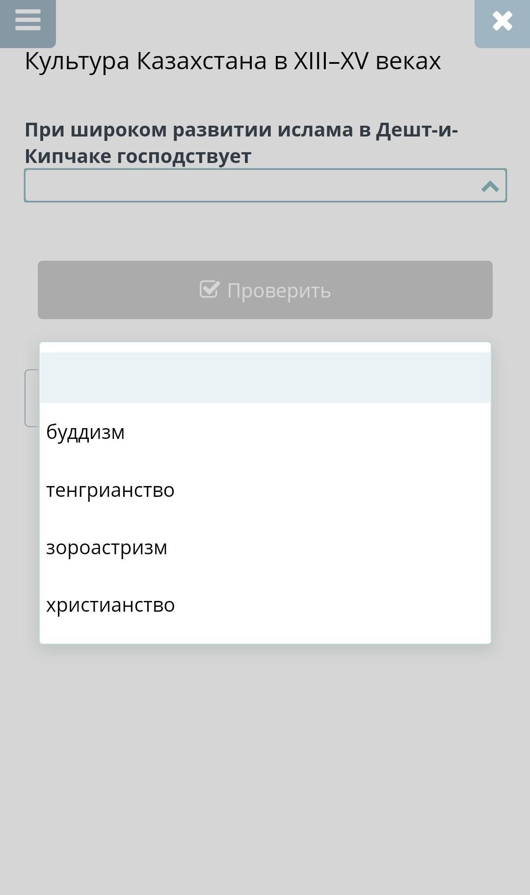 Культура Казахстана в XIII-XV веках При широком развитии ислама в Дешт-и Кипчаке господствует Проверить буддизм тенгрианство зороастризм христианство