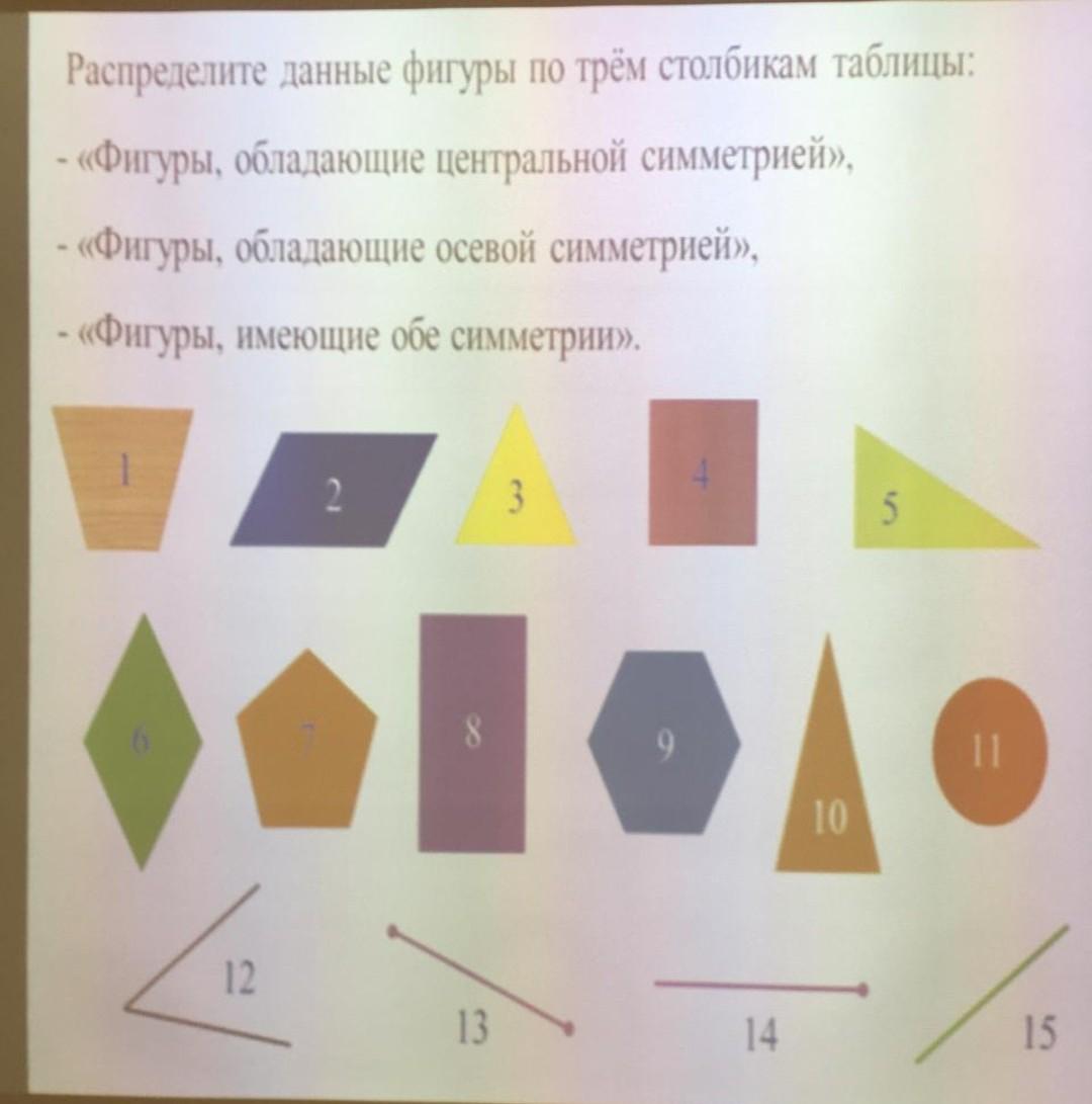 - фигуры, имеющие обе симметрии: 4, 6, 8, 9, 11, 13, 15