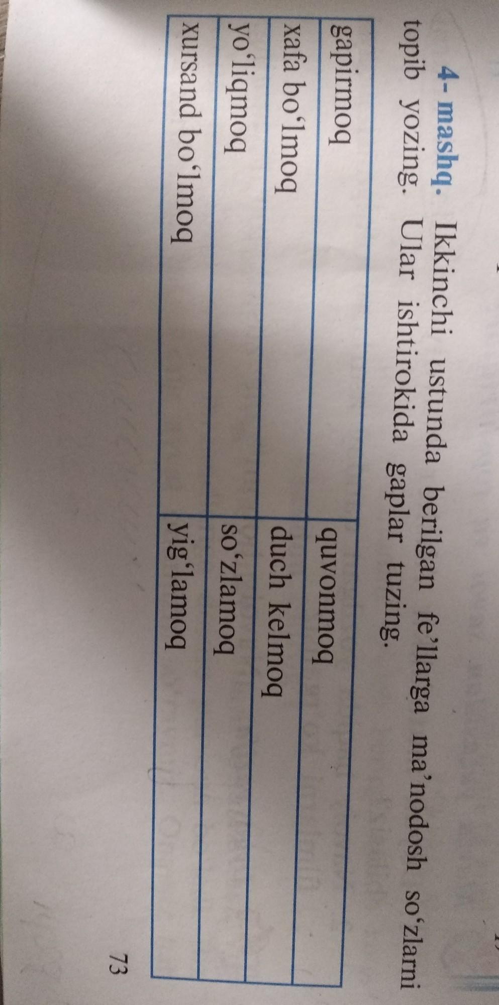 Ikkinchi ustunda berilgan fe'llarga ma'nodosh so'zlarni topin yozing.Ular ishtirokida gaplar tuzing.