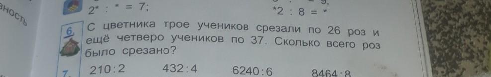с цветника трое учеников срезали по 26 роз и ещё четверо учеников по 37. сколько всего роз было срезано?