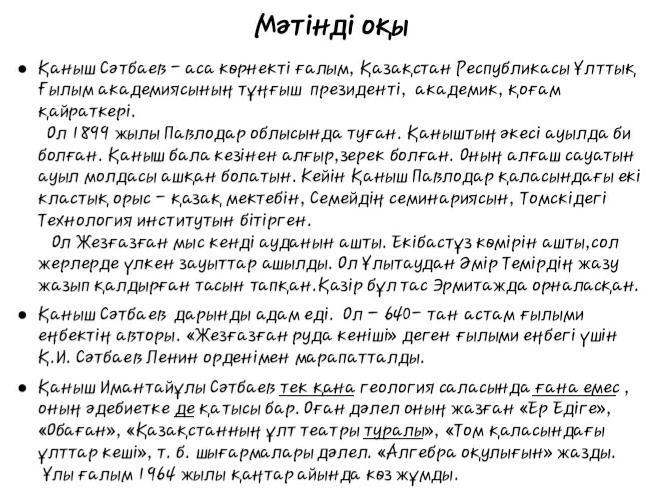 1)Қ.Сәтбаев-ғалым,академик,қоғам қайраткері,ҚР ұлттық ғылым академиясының тұңғыш президенті.
