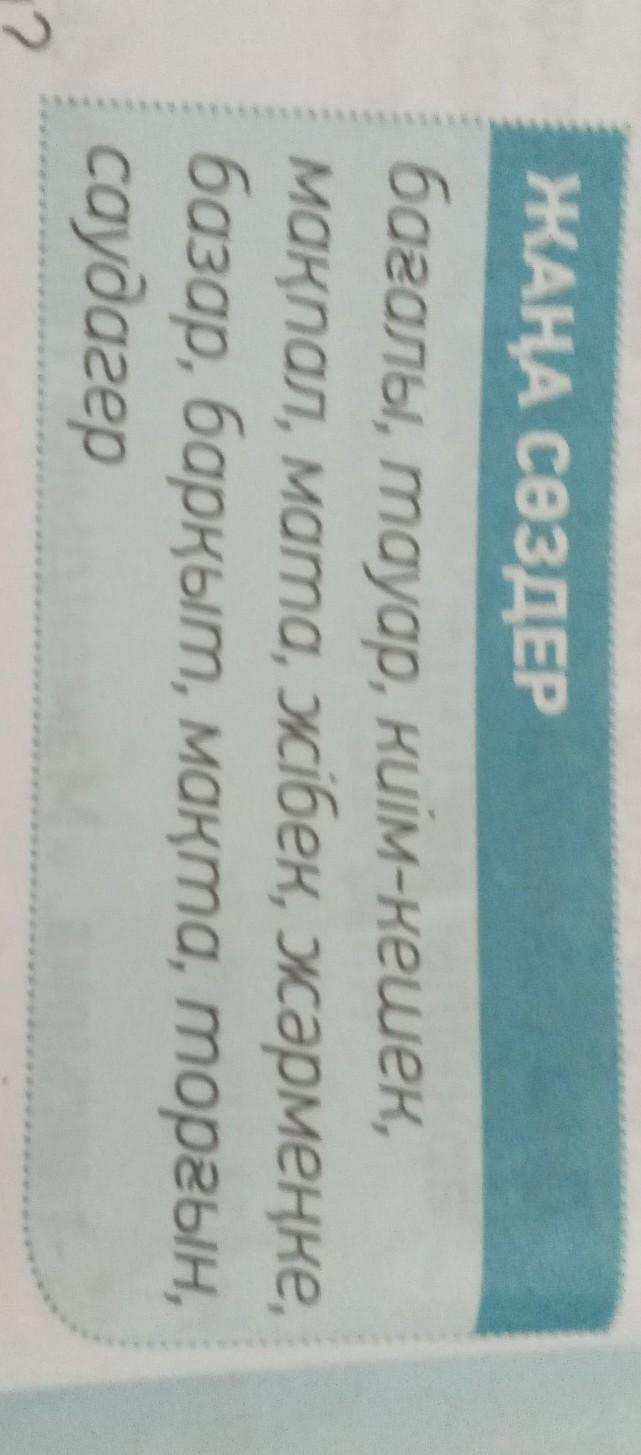 1. багалы -ценный , 2. тауар-товар, 3. киым-кешек -одежда ,4.макпал-бархат, 5.мата -ткань ,6. жибек-шёлк, 7.жирменке-ярмарка ,8.базар -рынок 9.барлык-бархат,10. макта-вата ,хлопок,11.торгын-тонкий шелк, 12.саудагер - торговец
