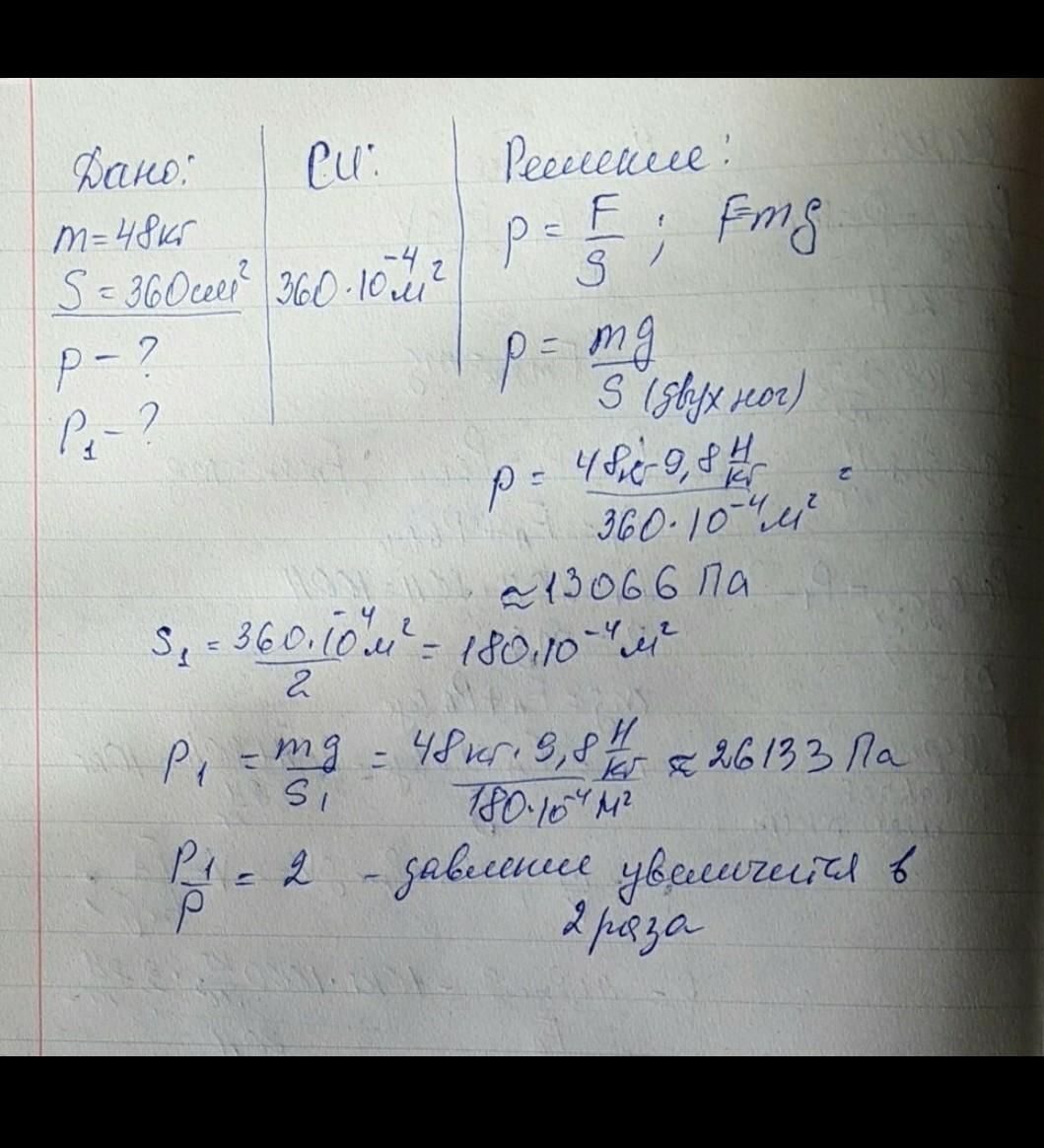 Человек стоит на полу его масса 84 кг,площадь подошв 420 см в квадрате.Какое давление оказывает человека на пол?Как изменится давление если человек станет на одну ногу?